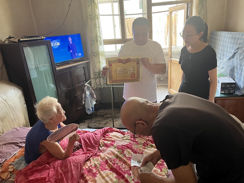 6月28日,安裝公司、物業(yè)公司聯(lián)合旱西關(guān)東社區(qū)工作人員組成慰問小組開展“慰問抗美援朝老兵遺孀 真情傳遞溫暖人心”慰問活動?;顒又?,慰問組一行前往抗美援朝老兵史黑則遺孀家中,詳細(xì)詢問了老人的生活和身體情況,叮囑老人要保重身體、安享晚年,并送去了牛奶、瓜果等慰問品。同時,慰問組一行還看到了保存多年的獎?wù)录白C書,大家紛紛表示要繼承革命先輩的光榮傳統(tǒng),汲取紅色力量,堅定奮進步伐,用實際行動迎接黨的二十大勝利召開。