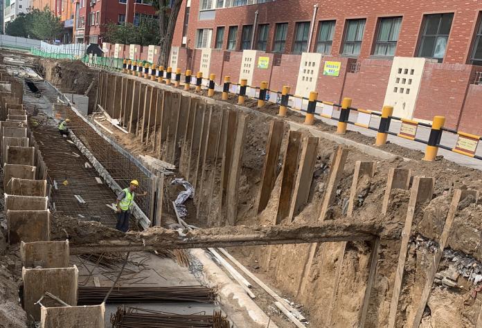 施工中,面對(duì)無法開展大面積施工,且施工路段無放坡條件等難題,項(xiàng)目部迅速行動(dòng)、倒排工期,將工期分解到周、計(jì)劃到天,各項(xiàng)安排落到實(shí)處,明確全員崗位職責(zé),組織機(jī)械和人工齊上陣,同時(shí)展開多個(gè)作業(yè)面,加速推進(jìn)工程進(jìn)展。在黑土巷中橫馬路郝家溝路段施工中,項(xiàng)目部采用打設(shè)鋼板樁支護(hù)措施,有效保障周邊建筑物安全,且該路段施工場(chǎng)地緊鄰學(xué)校,為不影響師生九月初正常通行,項(xiàng)目部安排施工人員加班加點(diǎn)對(duì)周邊拆遷產(chǎn)生的大量建筑垃圾和渣土進(jìn)行清運(yùn),并集中力量加快推進(jìn)該路段的施工進(jìn)度,組織人員晝夜輪替兩班倒,確保趕在正式開學(xué)前完成施工任務(wù)。