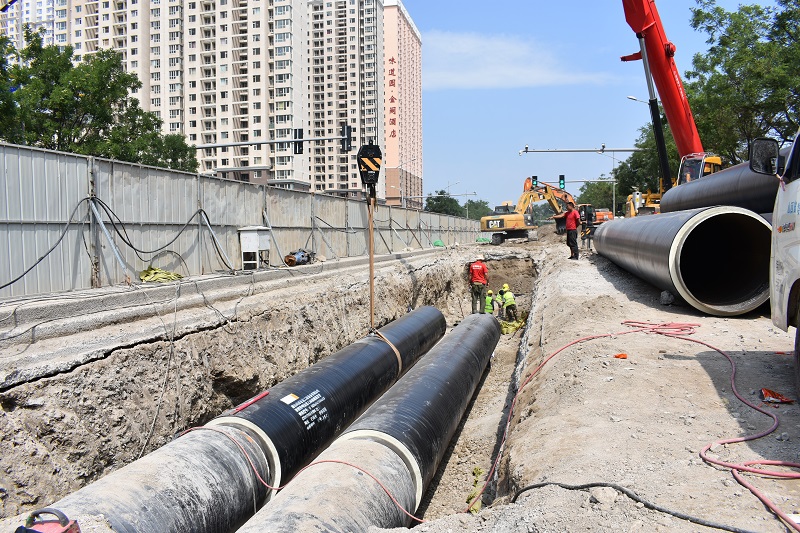 改造期間,項(xiàng)目部施工技術(shù)人員根據(jù)道路兩側(cè)預(yù)期規(guī)劃,提前制定了擴(kuò)改方案,使用設(shè)計(jì)管徑為DN1000的供熱管道,為轄區(qū)內(nèi)的小區(qū)預(yù)留出供熱余量。由于該工程位于老城區(qū),地下管線尤為復(fù)雜,加之前期現(xiàn)狀管線資料不全,施工開(kāi)始前,太原城市建設(shè)有限公司第五項(xiàng)目部的技術(shù)人員就提前做好溝槽的定位工作,采取整體放線、統(tǒng)一開(kāi)挖的辦法,通過(guò)計(jì)算,提前讓熱力管道逐漸改變坡度,有效避開(kāi)污水管道、燃?xì)夤艿赖日系K物。同時(shí),由于管道沿線區(qū)域地下水位高,施工人員根據(jù)現(xiàn)場(chǎng)實(shí)際情況,安裝了15個(gè)100毫米口徑的電動(dòng)多級(jí)離心泵進(jìn)行明排水施工,保證了施工進(jìn)度。