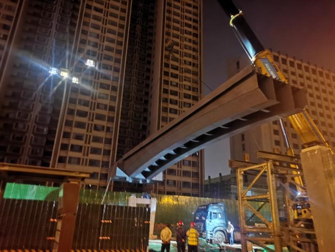 十項(xiàng)目部承建了北中環(huán)森林公園南門、濱河西路市圖書(shū)館北側(cè)、濱河西路三給街口共3座人行天橋。在北中環(huán)森林公園南門人行天橋的施工中,項(xiàng)目部結(jié)合橋梁跨度過(guò)大,北中環(huán)街車流量大等實(shí)際,組織全體參建人員加班加點(diǎn),24小時(shí)不停作業(yè),并合理安排夜間施工段進(jìn)行鋼箱梁吊裝工作。吊裝過(guò)程中,施工人員緊盯現(xiàn)場(chǎng),嚴(yán)格控制主橋軸線位置漂移量及臨時(shí)支架的搭設(shè)高度,保證每段鋼箱梁焊縫按規(guī)范要求進(jìn)行。同時(shí),在封路期間項(xiàng)目部提前與周邊小區(qū)物業(yè)進(jìn)行溝通,并安排專人在現(xiàn)場(chǎng)進(jìn)行疏導(dǎo),保證施工安全順利實(shí)施,用時(shí)3個(gè)晚上完成鋼箱梁吊裝工作,盡量減小對(duì)周邊居民的出行影響。截至目前,北中環(huán)森林公園南門人行天橋、濱河西路市圖書(shū)館北側(cè)人行天橋、濱河西路三給街口人行天橋主橋鋼箱梁已全部吊裝完成。三座天橋正在進(jìn)行主橋鋼箱梁焊接及梯坡道吊裝、護(hù)欄安裝、橋面鋪裝,恢復(fù)非機(jī)動(dòng)車道路面及人行道結(jié)構(gòu)等工作。