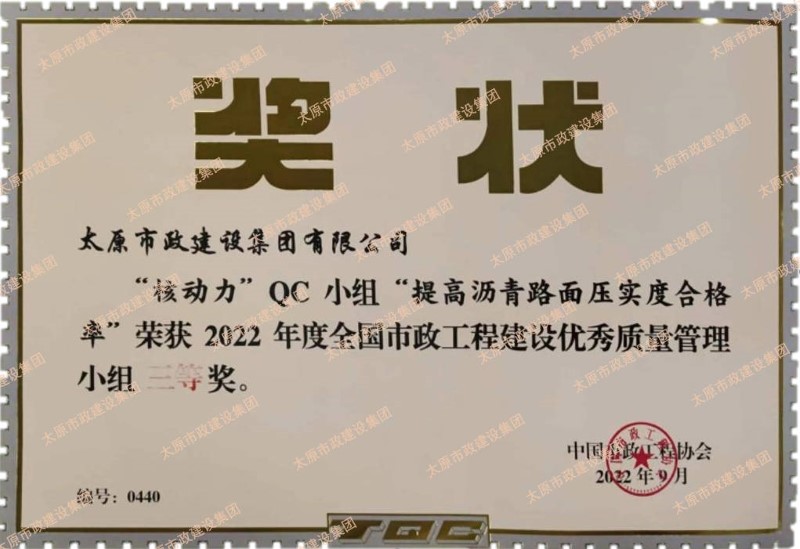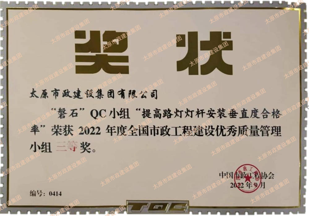 集團公司申報的“磐石”QC小組“提高路燈燈桿安裝垂直度合格率”、“核動力”QC小組“提高瀝青路面壓實度合格率”榮獲2022年度全國市政工程建設優(yōu)秀質量管理小組三等獎。