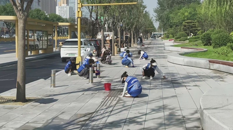 集團(tuán)公司黨員干部率先垂范,職工緊密跟隨,近200名“市政藍(lán)”奔赴工程現(xiàn)場開展志愿服務(wù),齊心協(xié)力對全線南、北半幅人行道的平石及側(cè)石進(jìn)行描金修復(fù)與污漬清理,同步推進(jìn)地磚灌縫精細(xì)化作業(yè),細(xì)心擦拭燈桿、隔離護(hù)欄、指示牌、公交站臺等城市“家具”,勾勒出城市綠化宜居“金名片”。