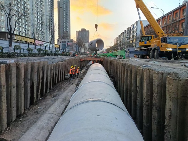 該工程位于勝利街,工程北澗河至解放路段道路全長1.74公里,規(guī)劃紅線寬度50米,污水管線主線長度為1919.5米,雨水管線主線長度為888.1米,雨污水管道施工采用明挖法與頂管施工相結(jié)合的方式。在新建管線區(qū)域,開挖深度超過5米,為確保施工安全,同時最大限度減少對周邊居民區(qū)的影響,基坑溝槽采用拉森鋼板樁進行支護。為保證鋼板樁施打位置準確無誤,施工人員在溝槽開挖后先進行場地平整,同時測量員進行定位,每隔兩米在中心線上插入鋼筋頭,以確保標記的準確性。打樁前,施工人員對鋼板樁進行逐個檢查。在插打過程中,實時進行監(jiān)測,保證每片鋼板樁的斜度不超過2%,樁體打入后,立即進行閉水性檢查,對漏水部位進行焊接修補,并安排專人每日對樁體進行檢查。項目部不斷提升施工安全管理水平,嚴格把控所有環(huán)節(jié),確保高標準高質(zhì)量完成每一項工作。