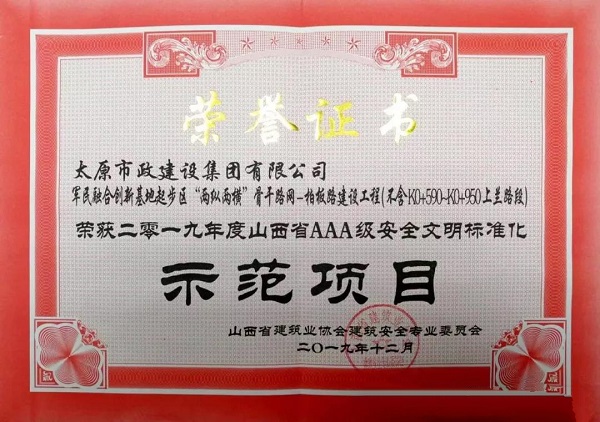 2019年12月25日,由集團(tuán)公司承建的“軍民融合創(chuàng)新基地起步區(qū)‘兩縱兩橫’骨干網(wǎng)絡(luò)—柏板路建設(shè)工程(不含K0+590-K0+950上蘭路段)”榮獲山西省建筑業(yè)協(xié)會建筑安全專業(yè)委員會頒發(fā)的“2019年度山西省AAA級安全文明標(biāo)準(zhǔn)化示范項(xiàng)目”榮譽(yù)稱號。