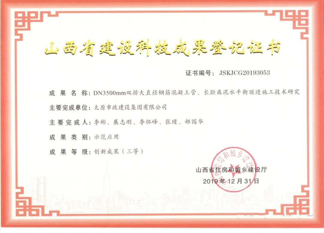 近日,集團(tuán)公司申報(bào)的《DND3500mm雙排大直徑鋼筋混凝土管、長距離泥水平衡頂進(jìn)施工技術(shù)研究》被山西省住房和城鄉(xiāng)建設(shè)廳評(píng)為創(chuàng)新成果(三等)。