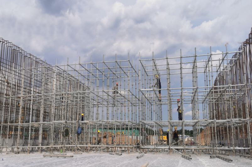 支架搭設(shè)提質(zhì)量 該工程在由東向西下穿東山過(guò)境高速公路的施工中,設(shè)計(jì)有1座長(zhǎng)65米、寬33米、高8米,單孔跨徑為18米的四孔通道箱涵。依據(jù)國(guó)家相關(guān)規(guī)定,該通道施工屬于超過(guò)一定規(guī)模且危險(xiǎn)性較大的分部分項(xiàng)工程,需要組織專(zhuān)家對(duì)施工方案進(jìn)行論證。項(xiàng)目部提前謀劃,開(kāi)工伊始責(zé)成相關(guān)技術(shù)人員制定專(zhuān)項(xiàng)方案,在六月中旬順利通過(guò)了專(zhuān)家論證,為后續(xù)施工奠定了堅(jiān)實(shí)基礎(chǔ)。針對(duì)該通道墻板厚、荷載大、支模架搭設(shè)跨度寬的情況,項(xiàng)目部按照規(guī)定要求,決定采用組裝快捷、使用方便、節(jié)省費(fèi)用、安全性達(dá)標(biāo)的盤(pán)扣式鋼管支架進(jìn)行打設(shè),確保高支?;炷翝仓踩€(wěn)定,有效保證了頂板支架搭設(shè)的施工安全。
