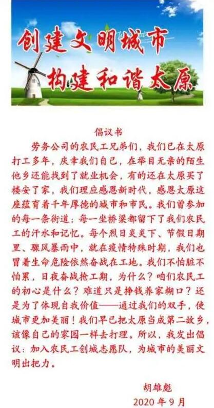自太原市開(kāi)展創(chuàng)城活動(dòng)以來(lái),太原市政集團(tuán)聚興勞務(wù)公司農(nóng)民工、全國(guó)五一勞動(dòng)獎(jiǎng)?wù)芦@得者胡雄彪第一時(shí)間向集團(tuán)公司3600余名農(nóng)民工發(fā)出倡議,鼓勵(lì)大家加入并組建一支農(nóng)民工志愿服務(wù)隊(duì),為太原創(chuàng)建全國(guó)文明城市出把力。