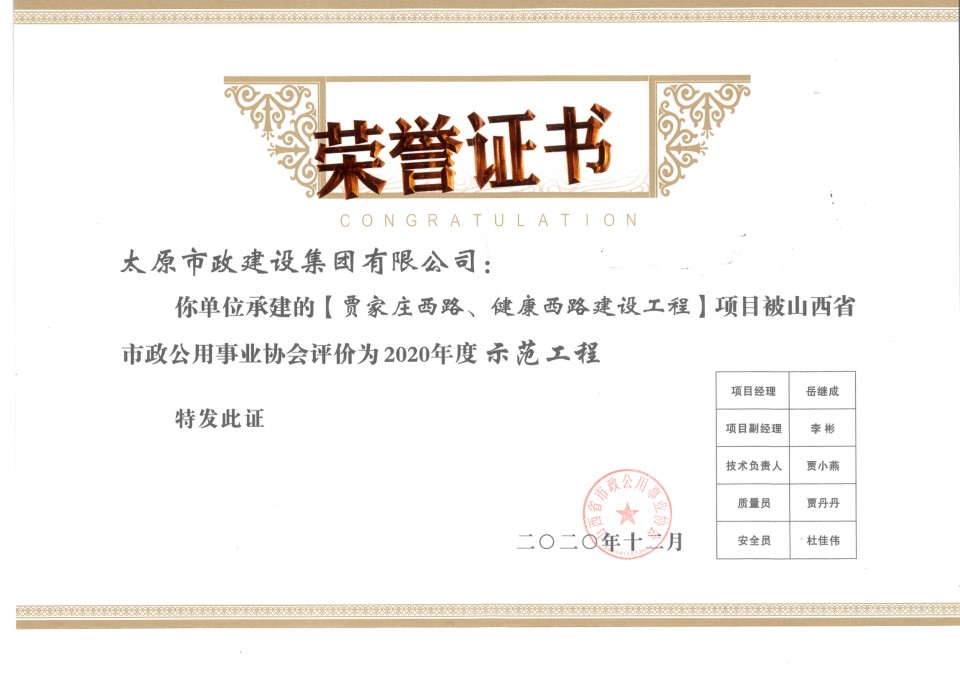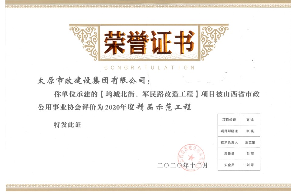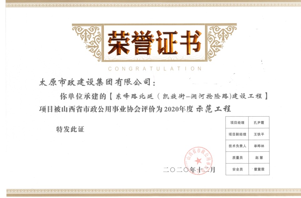 近日,集團(tuán)公司承建的塢城北街、軍民路改造工程被山西省市政公用事業(yè)協(xié)會評為“2020年度精品示范工程”,東峰路北延(凱旋街—澗河搶險(xiǎn)路)建設(shè)工程,賈家莊西路、健康西路建設(shè)工程被山西省市政公用事業(yè)協(xié)會評為“2020年度示范工程”。同時,高鴻、孔尹霞在2020年度山西省市政公用事業(yè)協(xié)會市政工程項(xiàng)目經(jīng)理評價活動中被評為“優(yōu)秀項(xiàng)目經(jīng)理”。