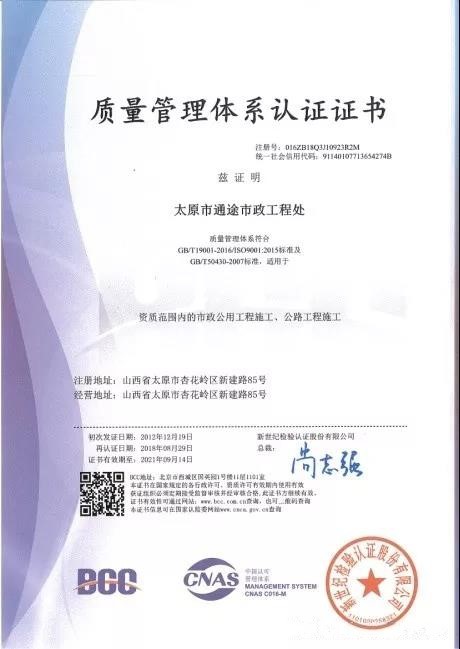 太原市通途市政工程處順利通過三體系認證審核 發(fā)布時間:2019-08-19 08:33:09  來源:本站  閱讀:25442